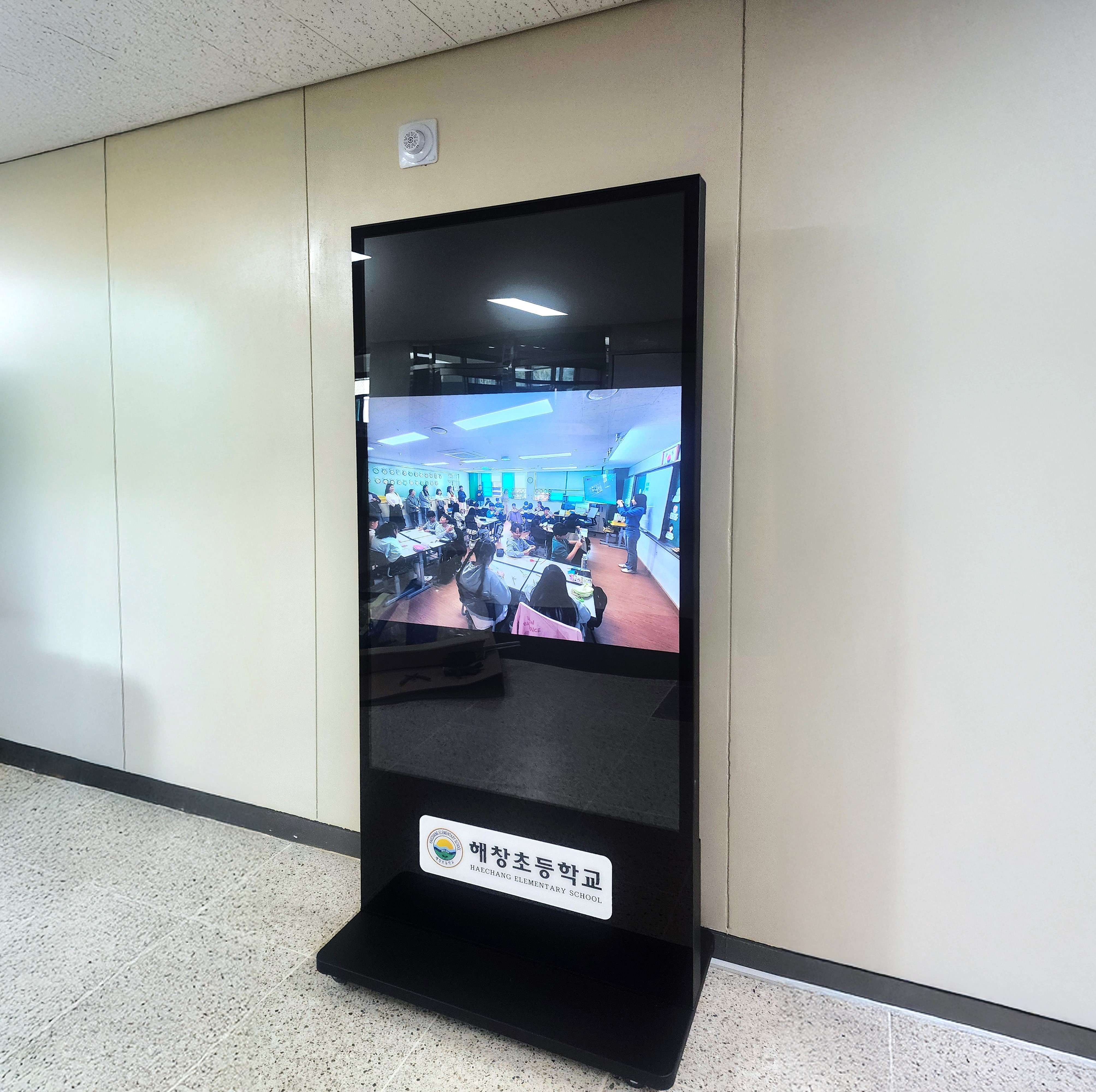평택 해창고등학교에 55인치 키오스크 모니터가 설치된 현장입니다. 복도에 설치된 키오스크 모니터는 행사 진행 모습이나 교실 내부를 실시간으로 비추어 학부모와 교직원들이 학생들의 안전을 확인할 수 있도록 하였습니…