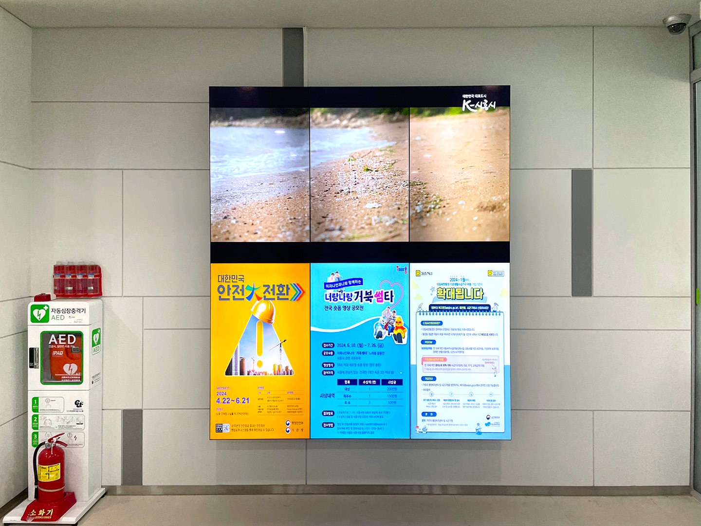 배곧2동 행정복지센터에 49인치 멀티비전 모니터 6대가 설치된 프로젝트입니다. [49인치 멀티비전 모니터 2x3 비디오월] 멀티비전 모니터는 얇은 베젤을 갖추고 있어 여러 대를 연결해도 이음새가 거의 보이지 않는 일체형…