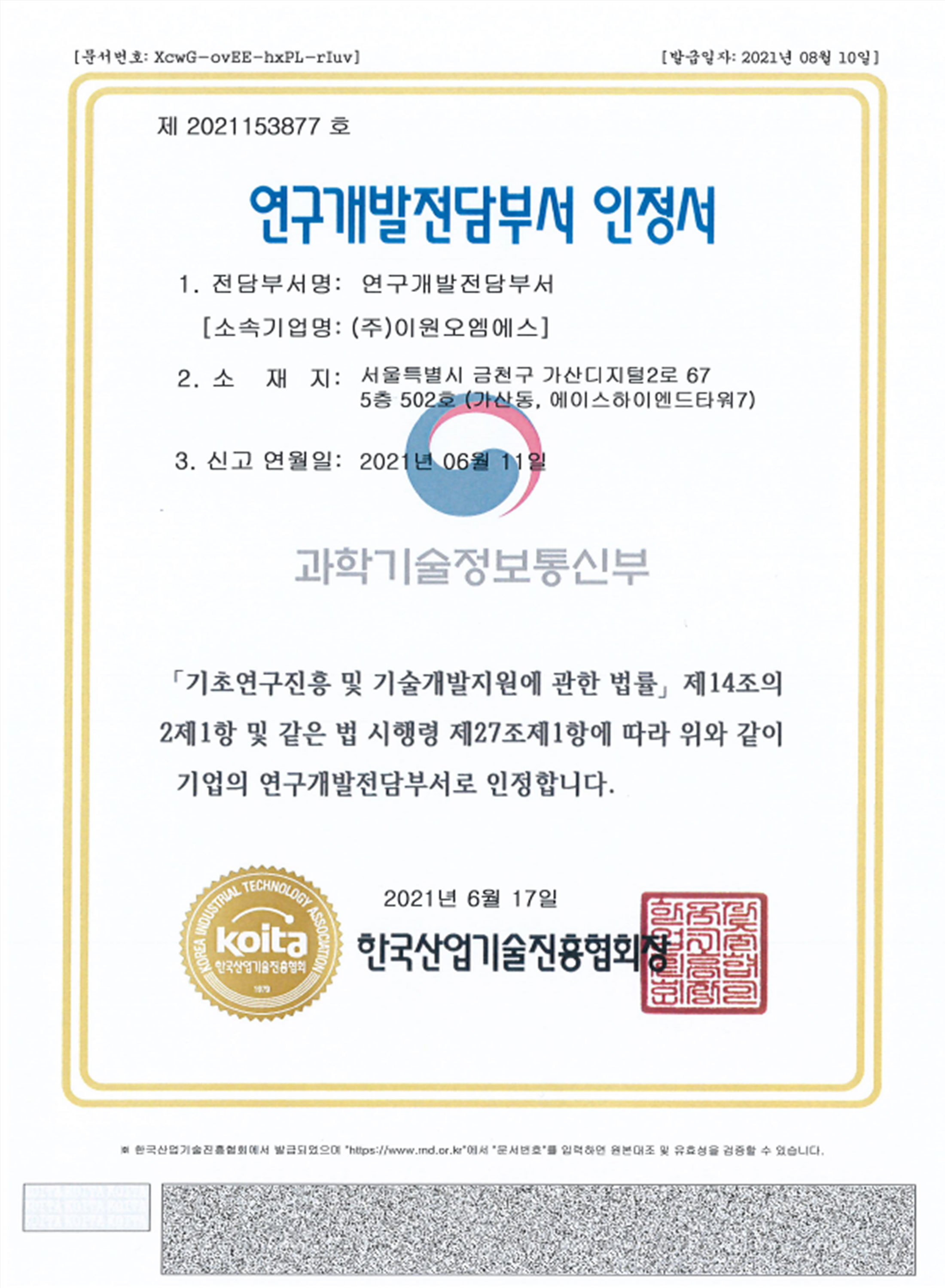 2021 연구개발전담부서 인정서