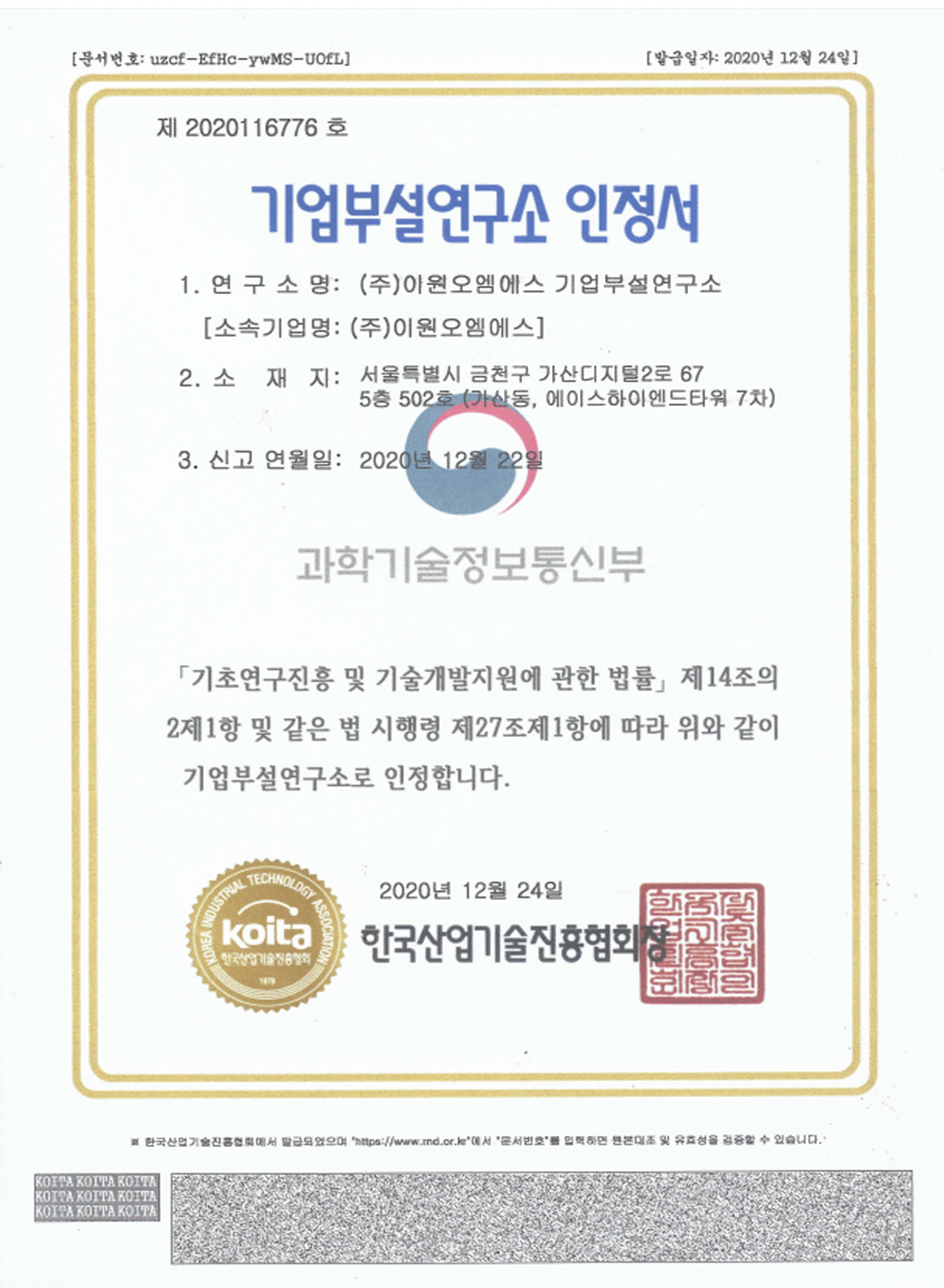 2020 기업부설연구소 인정서