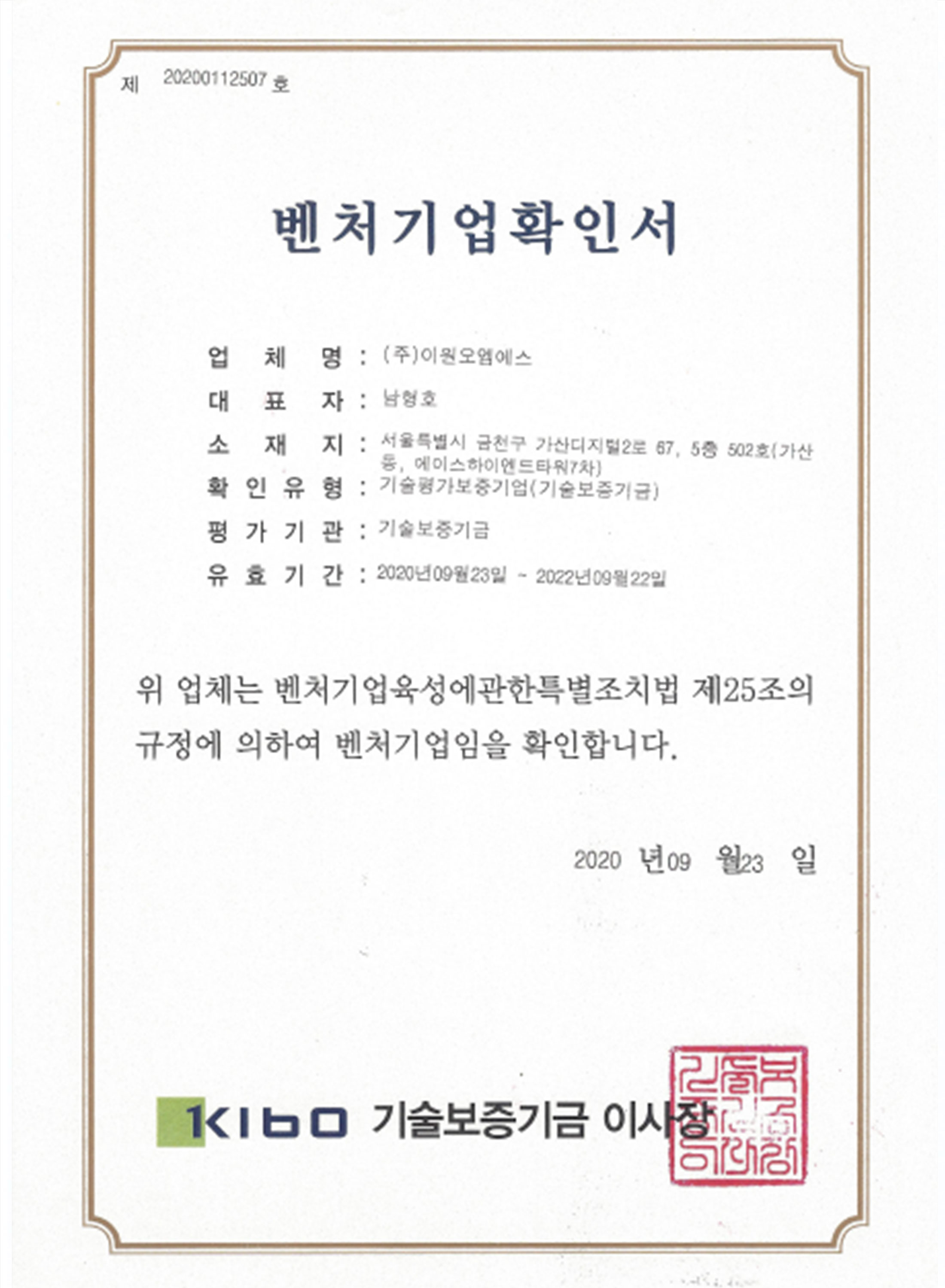 BLE모듈2020 벤처기업확인서